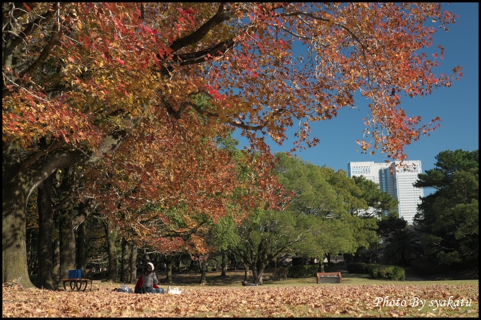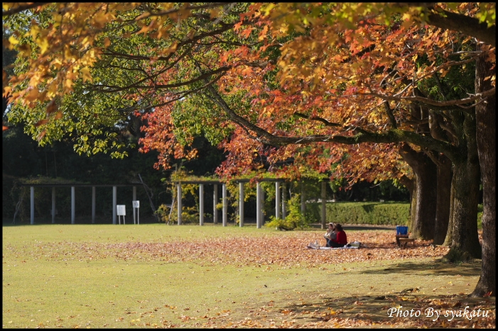 紅葉してたスズカゲノキの下でシートを引いて弁当持参でまったりしてる若い女性
